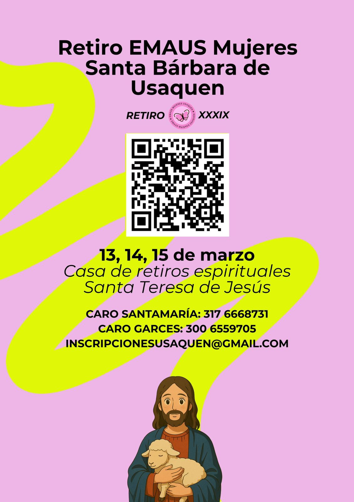 La Parroquia Santa Bárbara de Usaquén invita a todas las mujeres a participar en el XXXIX Retiro de Emaús, que se realizará los días 13, 14 y 15 de marzo de 2026, en la Casa de Convivencias y Retiros Espirituales Santa Teresa de Jesús.